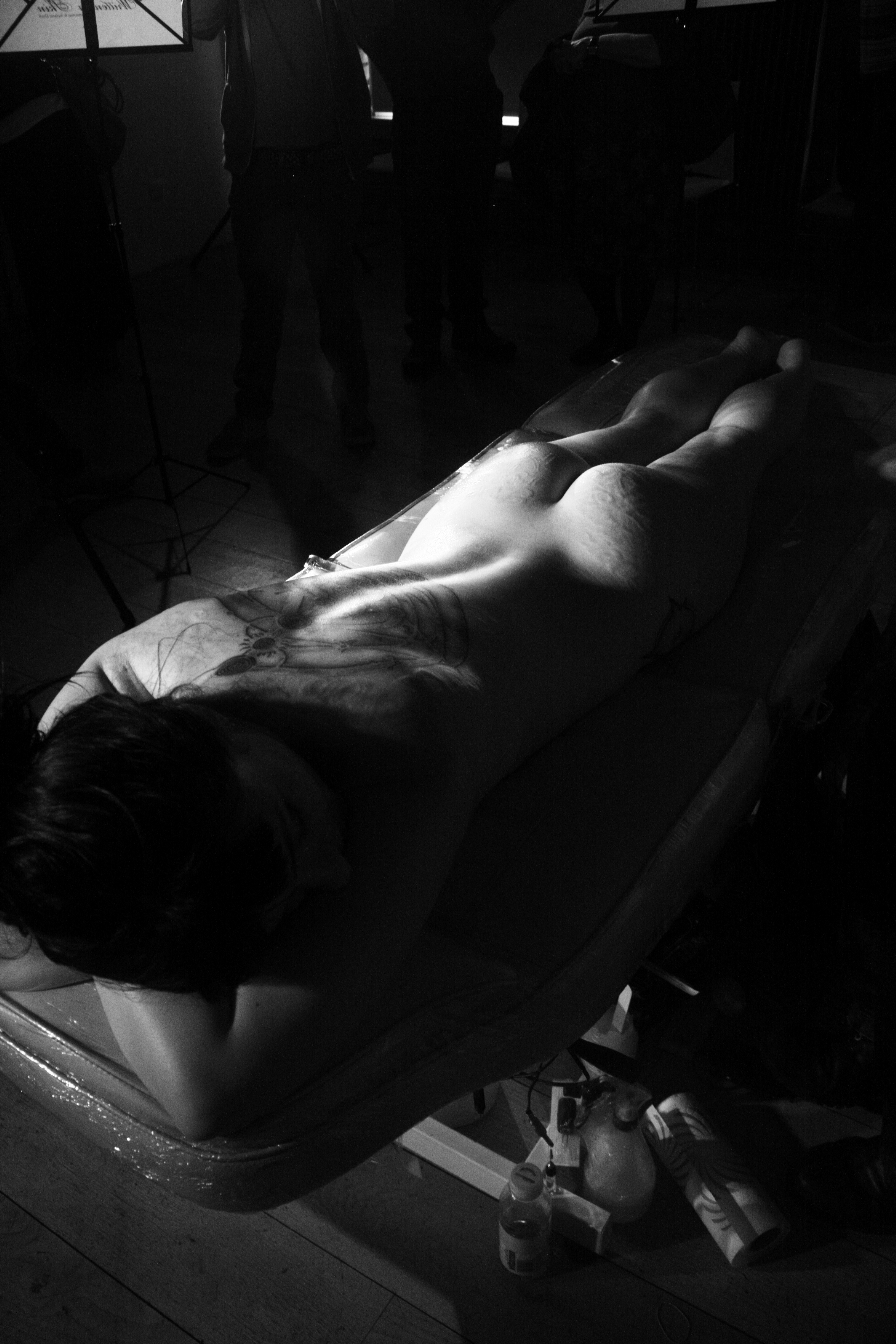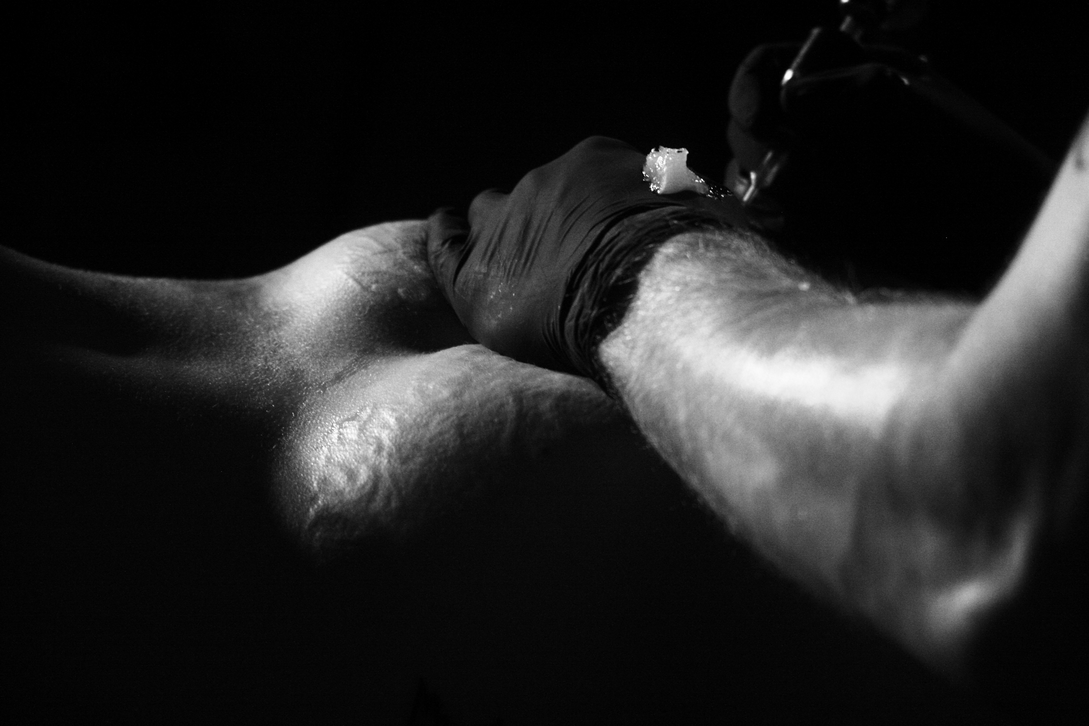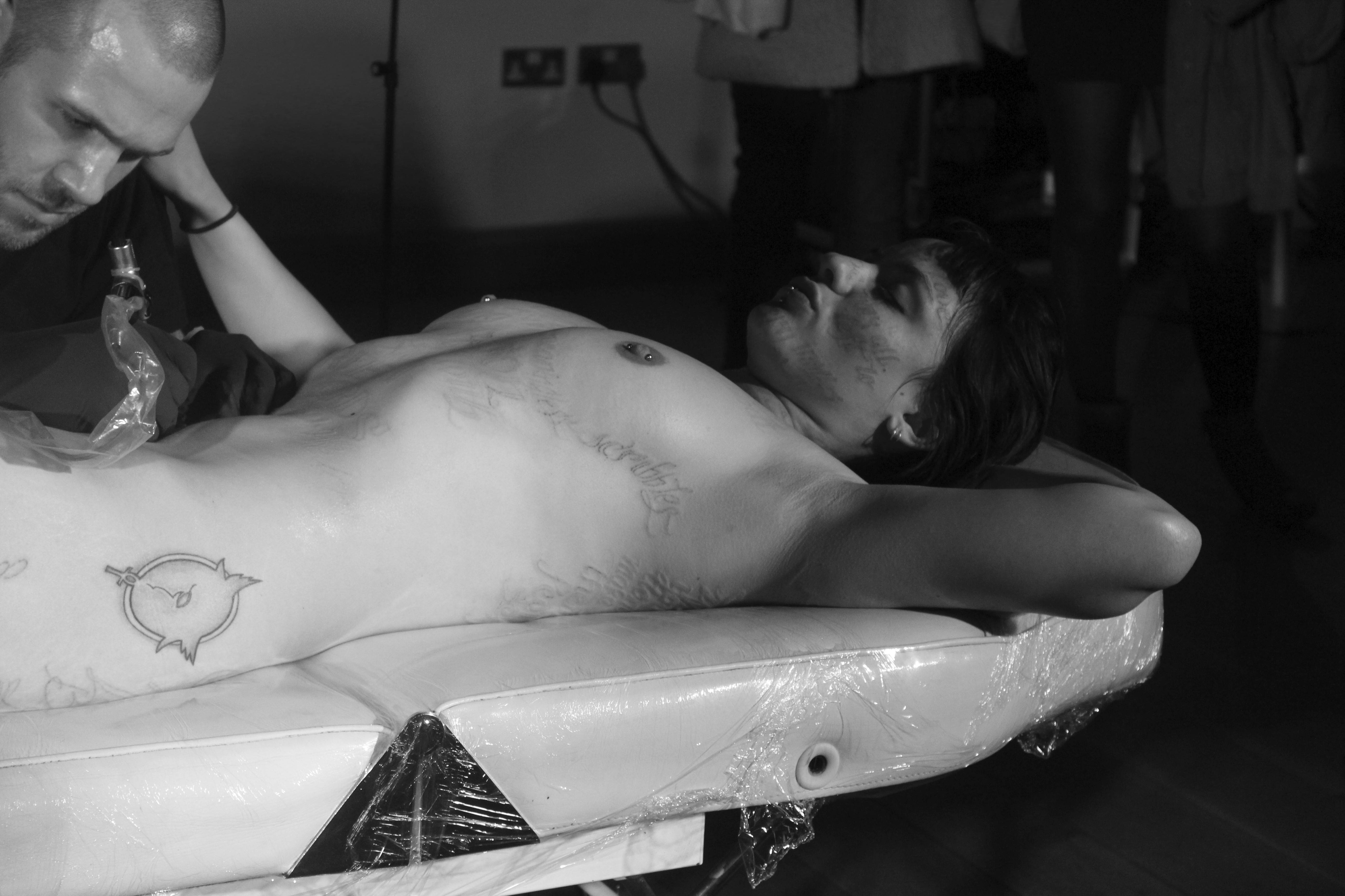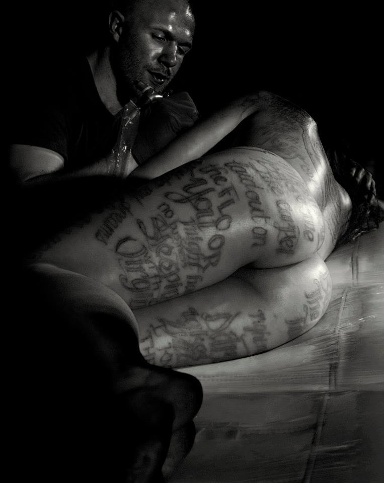 When it came to undressing I had purposefully worn the most comfortable and plain garments I could, jeans and a strappy top, so the act of undressing and becoming naked was less like a grand unveiling and more a casual everyday affair. I folded my clothes up in a neat pile on the floor under the bench and unceremoniously plonked myself down on the tattoo bench. I think it was a perfectly mundane beginning to the piece, which evolved into a ritual of intimacy, struggle and truth.