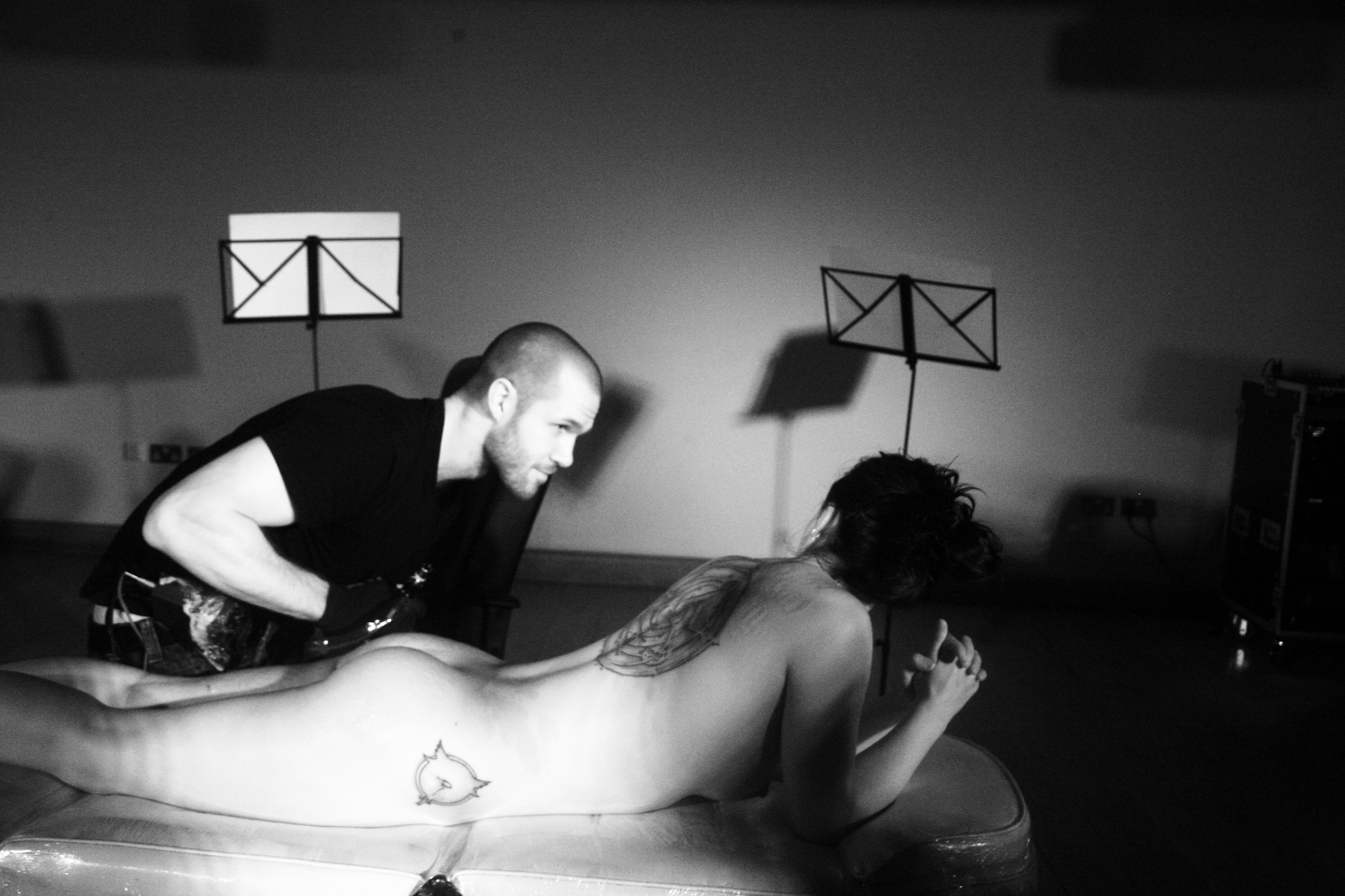 Despite my best efforts the energy flooding my body, conducted by Loren’s needles and the rawness of freshly etched flesh was spilling out of me without or without my consent and you could see people wincing and squirming along with me. I think the most interesting parts of the piece for me where when these random little ticks and movements materialised, I felt the need to constantly stretch and push excess energy out of my toes and fingertips. It was a kind of performance that was completely new to me, utterly spontaneous and completely unintentional. Energy is an immense elemental force that channels itself in some fascinating ways with or without our interference.